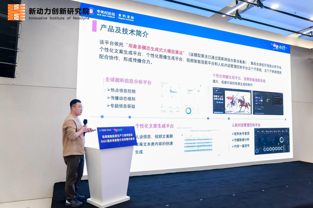2025年11月25日,由北京市科学技术委员会、中关村科技园区管理委员会、北京市朝阳区人民政府联合主办,中关村科技园区朝阳园管理委员会(北京市朝阳区科学技术和信息化局)、北京新技术应用促进中心、北京新动力人才创新研究院等单位承办,北京数智云科信息科技有限公司、北京伟世通经济咨询有限责任公司、中关村(朝阳)未来显示产业园、中关村(朝阳)互联网3.0产业园、首创·郎园Station等单位协办的“向新而行”场景赋能新质生产力系列活动——AIGC视听场景推介及供需对接会,在中关村(朝阳)未来显示产业园成功举办。北京新技术应用促进中心主任葛志杰、中关村朝阳园管委会副主任宋再星、中关村朝阳园管委会产业促进一处处长陈磊等领导出席活动。